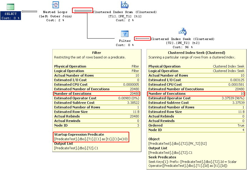 This time, table T1 was scanned (20480 rows), and the Startup Expression filter operator was executed for each of those rows. However, the index seek to table T2 was only executed 10 times. How did that happen?